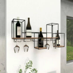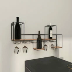 - This irregularly shaped wine shelf serves as a rack for bottles, glasses, accessories, and other table displays