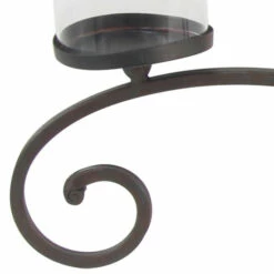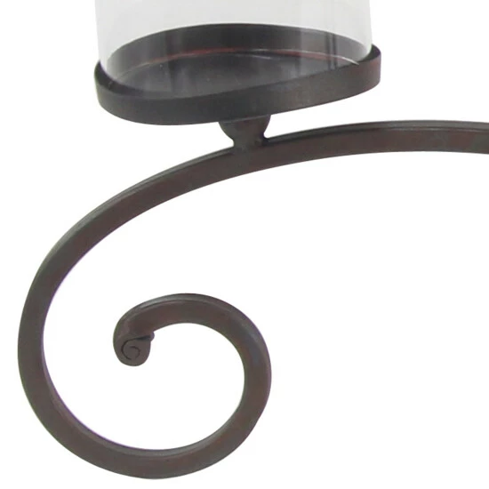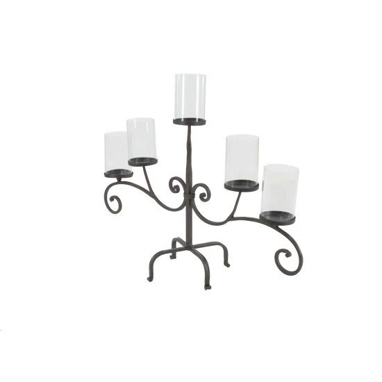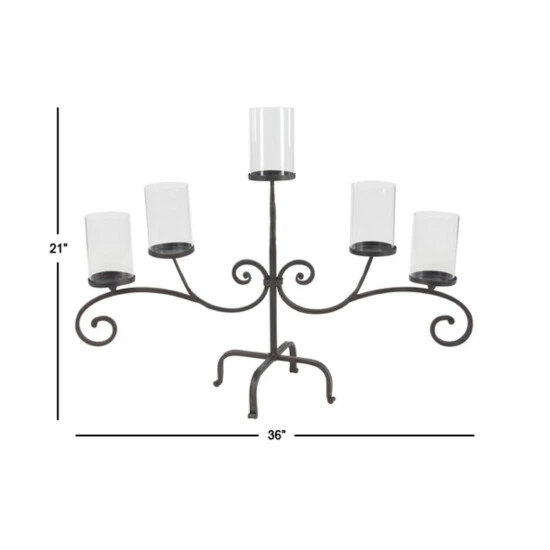 - Features 5 cylindrical glass candle holders with round plates and scroll arms