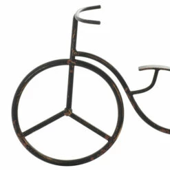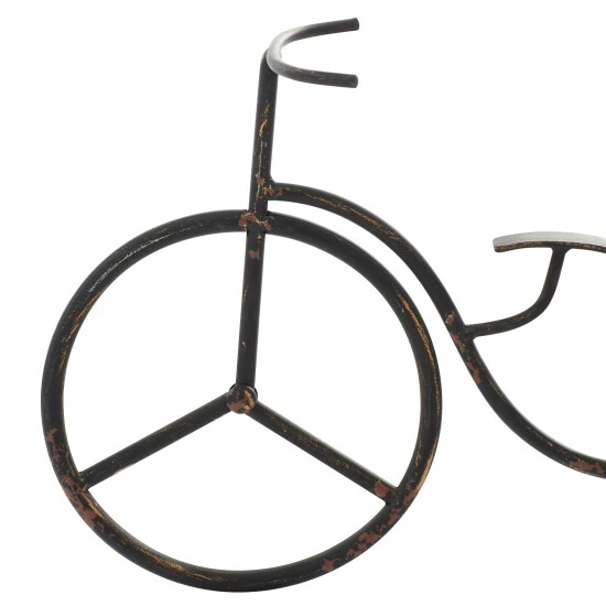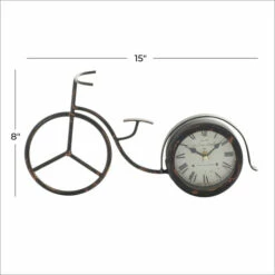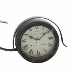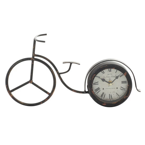 Pedal your way through time with this rustic distressed black metal decorative bicycle clock. This decorative clock is ingeniously crafted into a bicycle-infused art piece that features a complete distressed black finish for that vintage vibe. Parked on your shelf or table as a standalone decor or paperweight, this bicycle clock is a timeless piece for your country, farmhouse, boho, or any traditional-themed home space. Requires 1 AA battery, not included. This item comes shipped in 1 carton. Roman numbers are in black, with hash marks, on a white face. The clock mechanism runs silent. Suitable for indoor use only. Farmhouse-themed style. Metal clock makes a great gift for any occasion.
