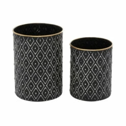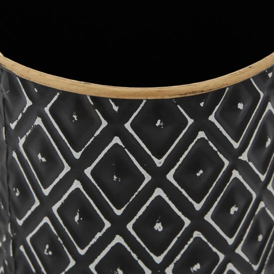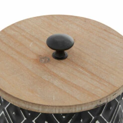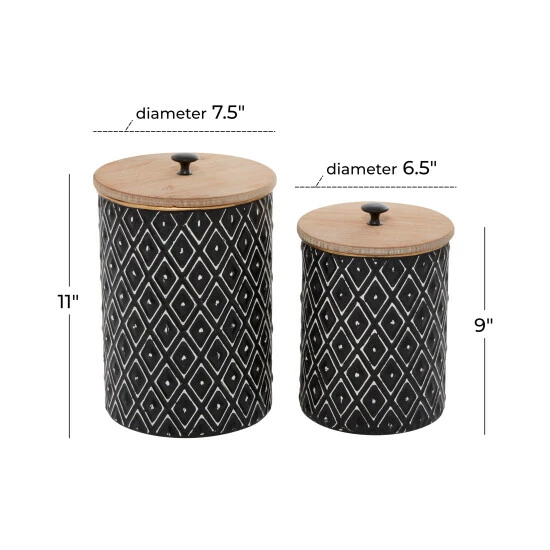 Organize your farmhouse living space with these black metal cylinder container with wooden lids. These containers are decked with embossed white diamond patterns and gold-finished rim over a full black base finish. It also feature highlights round natural-finished wooden lids with knob handles. Used as standalone or as set of 2 on your dining, living room or bathroom for additional storage needs. These cylinder containers are excellent additions to your farmhouse-themed home. Please note that this item is for decorative purpose use only and are not food safe. This item ship in one carton