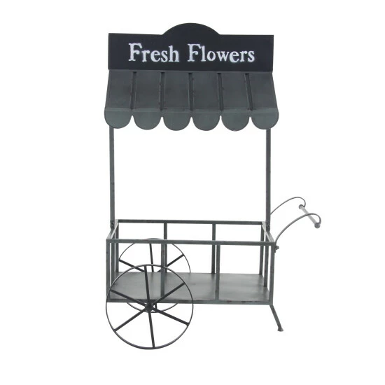 This Farmhouse style flower cart has adorable style, from its rolling canopy with a “FRESH FLOWERS” stencil to its large, old-fashioned wheels. Made from iron, this garden cart is lightweight and easy to pull from by large arched handle and sits upright on the metal kickstand to keep your potted plants in place. The rectangular planter box has iron bars to secure your pots but are spaced enough for beautiful display. The large, metal canopy keeps direct sunlight from harming your more sensitive perennials. This outdoor planter plant stand will bring a cozy feel to your garden area entryway or enjoy it in the backyard from your deck. This stunning trolley cart plantstand is ideal for outdoor usage and blends well with vintage and retro-themed furniture Wipe clean with a dry cloth. Lightweight & easy to pull. Suitable for indoor and outdoor use. Farmhouse-themed style Showcases a spray-painted “FRESH FLOWERS” text in white. This item comes shipped in one carton. Maximum weight limit is 5 lbs. per shelf.