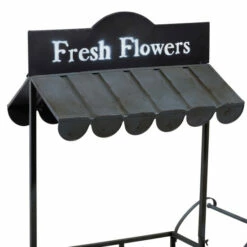 - Metal plant stand with 2 large wheels, kickstand, and a curved handle; soft black finish over entire metal cart with “FRESH FLOWERS” stenciled in white paint at the top