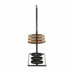 Display your wine bottles with this black eclectic 3-bottle metal wine holder with wooden ring accents. Made from metal, its frame is creatively shaped into 3 individual wine bottles with rounded plates as bottle holders and extends to form a slightly leveled stand. This decorative wine bottle holder features wooden ring accents for support and a black overall finish. Placed on your counter or dining table, this wine bottle holder is an eclectic addition to your modern and contemporary-themed home. This item comes shipped in one carton. Suitable for indoor use only. This item can hold 3 wine bottles and features a 16″H x 17″L x 6″W inner dimension. Farmhouse-themed style.