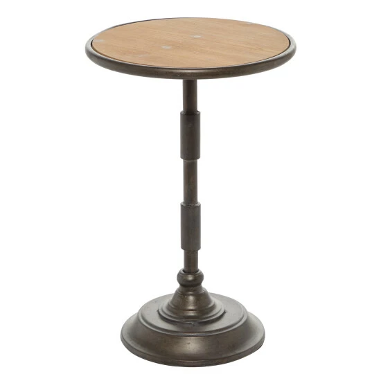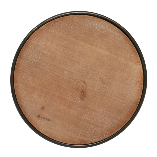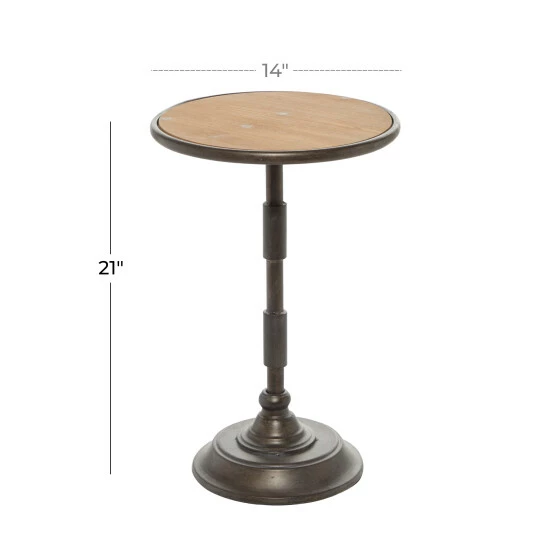 - This round metal accent table features a dark brown iron finish and a naturally textured brown wooden finish