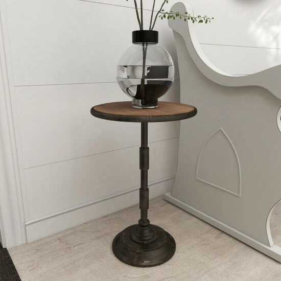 - This stunning round accent table is made of sturdy iron and wood materials