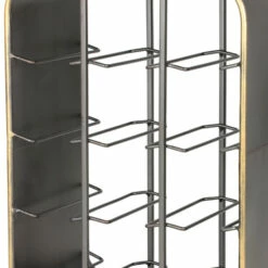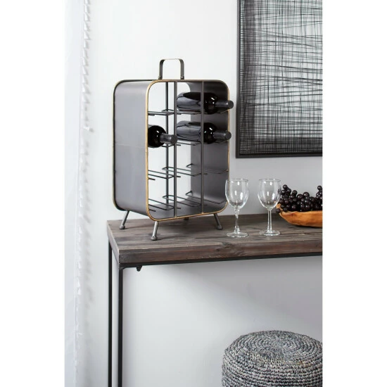 Display and organize your wine bottles with this industrial wine bottle shelf displayed on your table top. Display your wine bottles with style and make everyone thirsty with envy. Looks stylish in your living room or kitchen as a way to display and serve your favorite wines. Designed with rubber stoppers at the base that prevent scratching furniture and table tops, as well as sliding around. This item comes shipped in one carton. Suitable for indoor use only. This wine rack can hold up to 12 standard size wine bottles. Designed with an industrial theme.