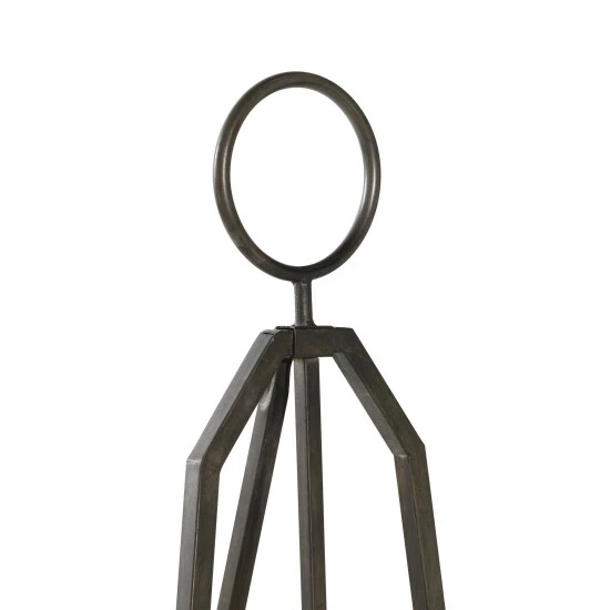 - Tall angled tripod base with a large circle finial, all painted in a black metal finish and black chain for retractable back leg