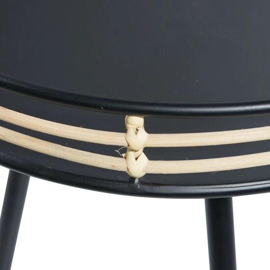 - This elegant metal coffee table showcases a polished black-finished tabletop and body/leg framing that is further accentuated by crafty, cream white-colored natural rattan fibers