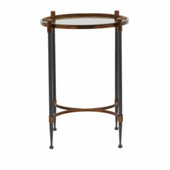 - This small round accent table features a clear glass table top, polished black legs, and mahogany brown accent frames