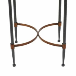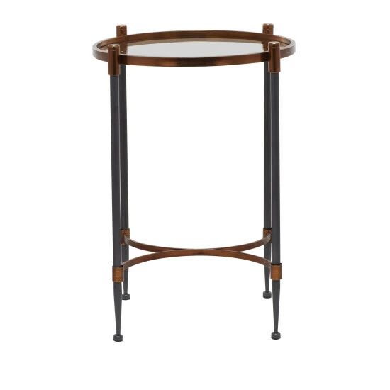 Add a touch of luxury into your common room areas as you stylize this ravishing metal end table with earth toned walls and hardwood floors. A compact friendly table providing you with additional storage space any where in your home. Useful and elegant, side tables are more than just a place to throw your mail or place a lamp. Designed with black rubber stoppers at the base that prevent scratching furniture and table tops, as well as sliding around. This item is shipped in one carton. Iron is forged and tempered glass is attached into the base to form a stunning end table design. Suitable for indoor use. Traditional style. Maximum weight limit is 250 lbs.