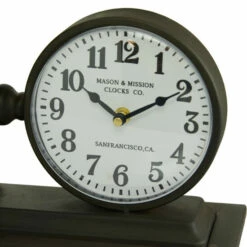 This vintage black metal table clock will give off a timeless classic vibe when displayed on accent, or console tables in your living room. Placed on your console or coffee table, this table clock is sure to be a timeless addition to your home or office. Placed on your office or library shelves, tables, or consoles, this clock is sure make you on time for a style home. Requires 1 AA batteries. Not Included. This item comes shipped in one carton. Easy-to-read Arabic Roman numerals on a white clockface. The clock mechanism runs silent. Suitable for indoor use only. Traditional theme.