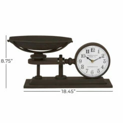 - This traditional style inspired design black iron metal table clock features a vintage weighing scale platform appearance with an antique feel and finish