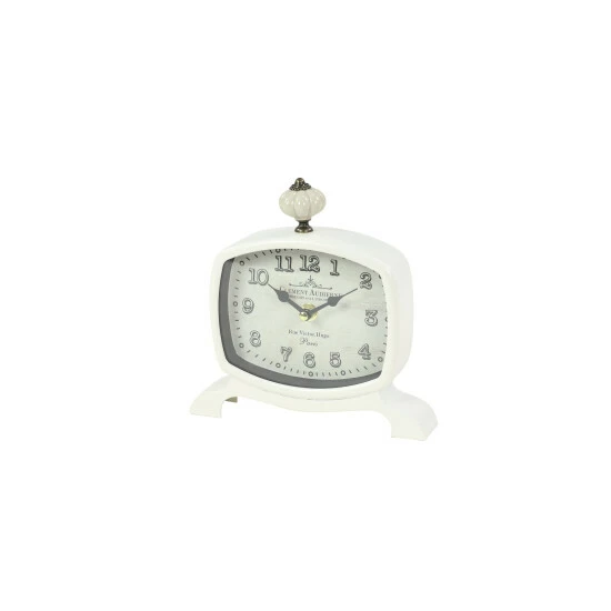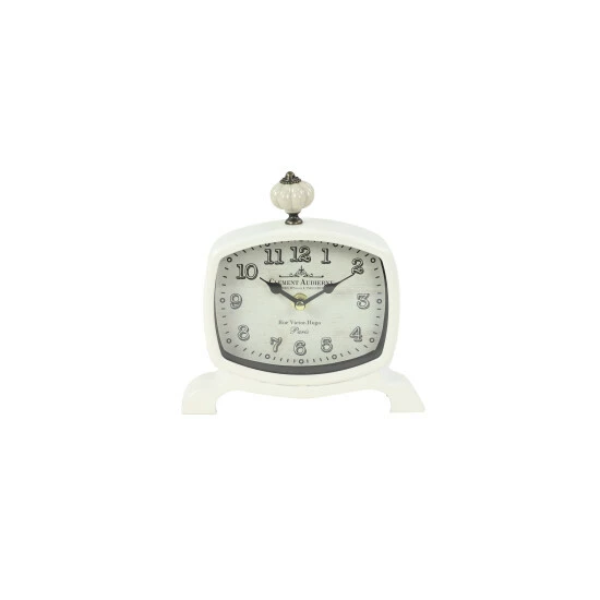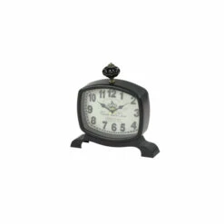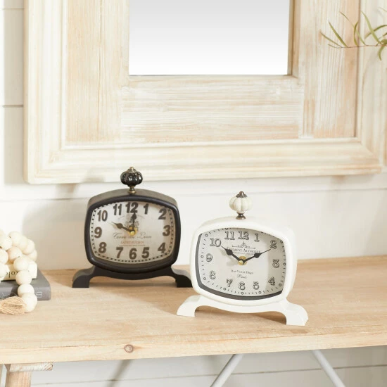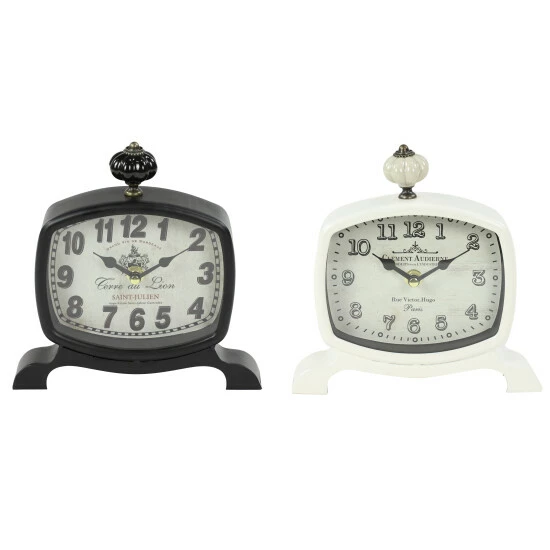Create vintage style in your home by simply displaying them on side tables as supplementary décor and adding another on your night stand or home office desk for an effortless time check every time. Stylish and functional, this set of 2 rectangular metal table clocks make for great accent table decor pieces for your vintage-styled space with their gourd-shaped finials, wide serpentine feet, bold serif numbers, and elegant French script. Requires 1 AA batteries. Not Included. This item comes shipped in 1 carton. Features Arabic numerals for the hour and minute markers. The clock mechanism runs silent. Suitable for indoor use only. This set includes 2 clock. Clock face with text “Grand Vin De Bordeaux”, “Cerre Du Lion”, “Saint- Julien” and “Clement Audierne”, “Rue Victor. Hugo Paris”. Vintage inspired.