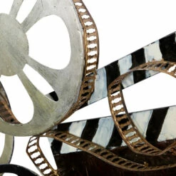This vintage wall decor has fun interior design written all over it. It is a great addition to any home or office of movie lovers and filmmakers. Two silver and one black film reels are layered on top of each other with coiled film and a classic black and white clapboard reading “TAKE 1. ” This movie wall art is made from iron and hangs on walls via a keyhole backing. Suitable for indoor use only. Typography, ‘TAKE 1’. This item comes shipped in one carton.