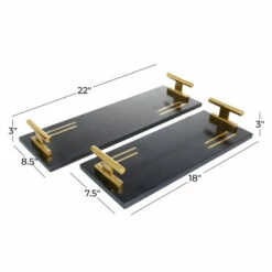 Stylize these lavish trays on top of kitchen islands, console tables, or bathroom counters for that effortlessly glamour vibe. A storage piece that is spacious for your trinkets or decorative goods on your mantle, coffee table or kitchen counter. Keep your table top protected as you display your memorabilia and belonging on these trays. Designed with black rubber stoppers at the base that prevent scratching furniture and table tops, as well as sliding around. This item is shipped in one carton. Marble stone is intricately cut and aluminum handles are attached to the sides to form a spectacular set of rectangular trays. Suitable for indoor use. Marble is a product of nature and no two pieces are exactly alike, it is prone to variations in color and/or patterns in the material that adds to the beauty and charm of the piece. Made in India. These trays come as a set of 2. Contemporary style.. Crafted in a contemporary style that fits great in most homes. These decorative black trays are made of fine quality marble stone and aluminum. These 2-set marble trays feature a black marble tray with gold linear accents and metallic gold aluminum handles. These black marble trays feature a flat and rectangular base structure with T-shaped handles and eye-catching line accents at the opposite corner of the trays. Each item measures 22″L x 8″W x 3″H , 18″L x 8″W x 3″H and weighs 18 lbs