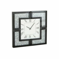 Add style and function to your wall setting with this square analog clock. It features a square white clock face with prominent black Roman numeral markings and hands which ensure convenient time reading. This wall clock also dons black inner and outer frames and geometric dividers with silver embellishments in between, giving off a touch of modern glamour to any room or space. Purchase this chic timepiece today at a price that won’t hurt your pocket!
