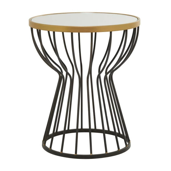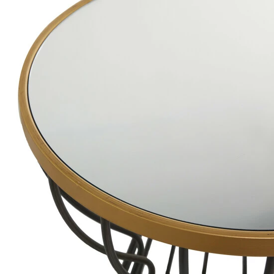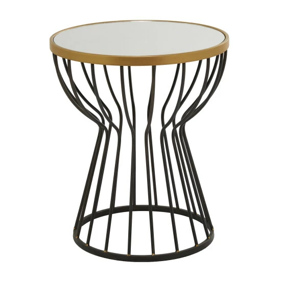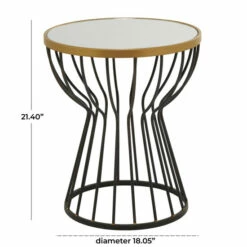 - Decorative accent table featuring a round mirror top supported by a black drum-shaped metal frame with an open design