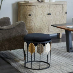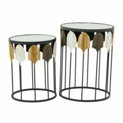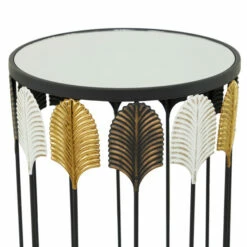 - Black round end table set carries metallic gold, silver, and white leaf accents