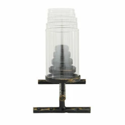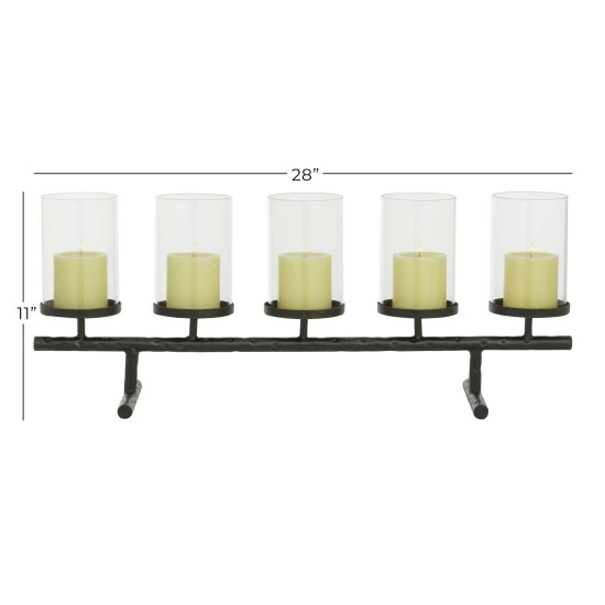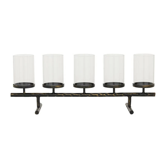 Place this candelabra centerpiece on your mantel or end table for contemporary style. Delight your guests and make any occasion extra special by adding lighted or flameless candles to this candelabra. Made with a sturdy base, it is perfect for creating an elegant atmosphere at your table top or mantel. This table candelabra holds five votive candles. This item comes shipped in one carton. Hammered metal rod holds glass hurricane candle holders. Suitable for indoor use. This is a single-piece 5-pillar votive holder. Contemporary design.