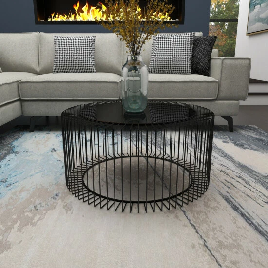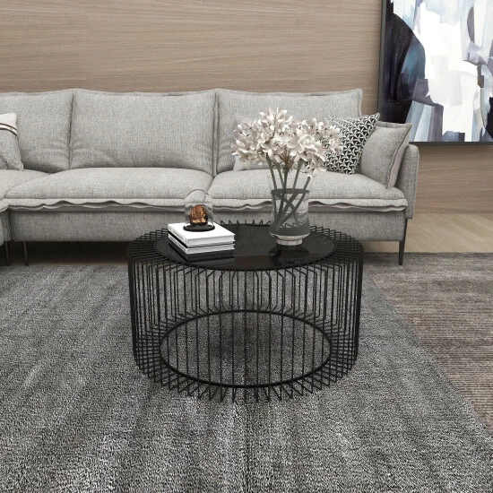 - This stunning black metal coffee table features clean lines in an open style structure with spacious under clearance and complemented with a round sturdy glass top