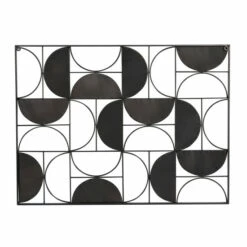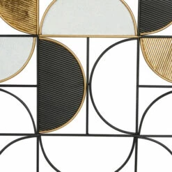 Bring elegance and energy into the room with this black and gold wall art. The metal wall decor features a series of semicircles in a variety of orientations. Some of the semicircles feature textured white and black surfaces. Some are striking gold pieces that capture your eye from across the room. Others are empty frames, allowing you to see the wall beneath. The entire work of art is solid iron and works well when you want to create a glam-style room.