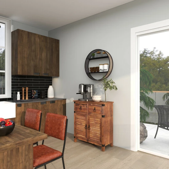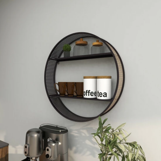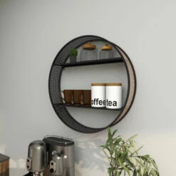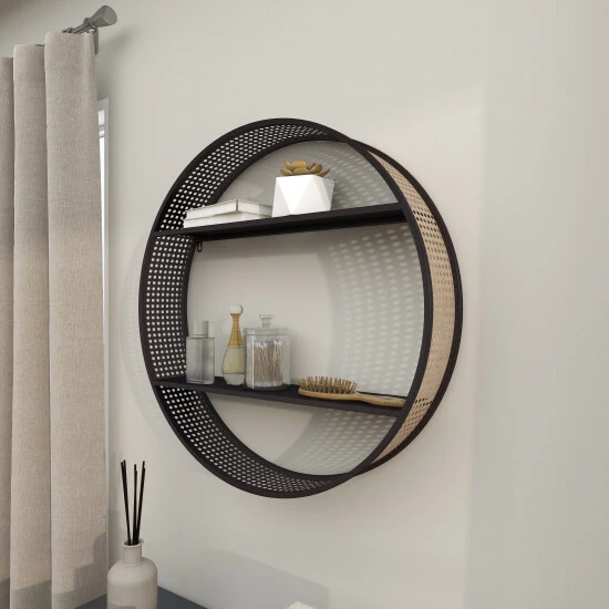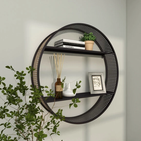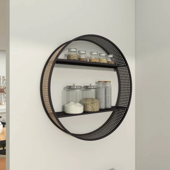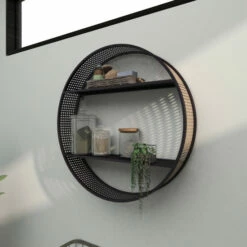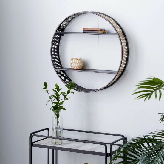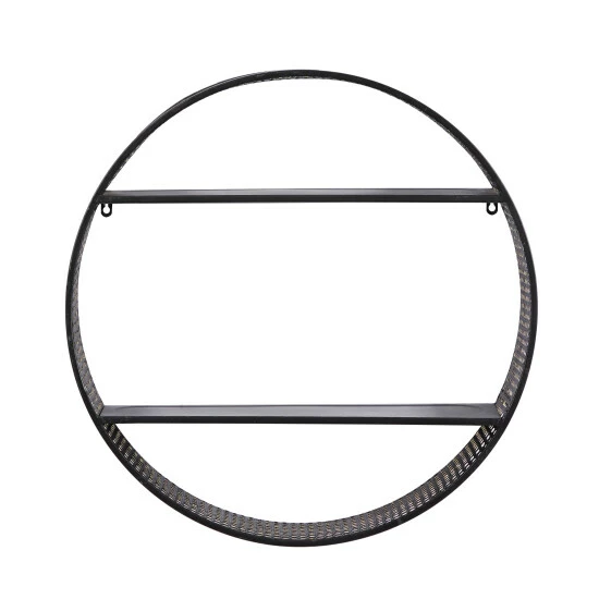 This large black round wall shelf will add industrial and eclectic ambiance to your home. Your wall decoration ideas make the rules with this wall mounted decor, no matter where or how you hang it—in the kitchen, living room, bedroom, entryway, or even your work area. This round wall shelf features striking black metal finish and round hole pattern. It allows you to place objects on each shelf inside the unit. With versatility running in its material, this metal shelf is perfect for accent Decor, indoor plants, framed memories, or other small home decorations. This item comes shipped in one carton. Two storage shelves inside for ample storage purposes. Lightweight and easy to hang with keyhole slots. Suitable for indoor use only. Holds up to 20 lbs. Contemporary design.