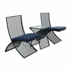 This metal outdoor furniture set can be displayed and used in the garden, patio, poolside, or veranda for lounging. Cushions should be stored indoors when not in use. Make your outdoor patio an ideal place for gatherings and entertaining for your love ones. An all weather seating set that will keep you connected to nature and the outdoors at the end of hard working day . This item ships in two cartons. Use water with simple cleaning solution on the wooden legs and wipe dirt off with a soft cloth, rag or paper towels. Cushions should be stored indoors when not in use. The fabric will fade over time, be sure to turn cushions regularly to equalize the color change. Polyester cushion cover is removable and washable with soap and water. Suitable for indoor and outdoor use. Maximum weight limit is 50 lbs. Use water with simple cleaning solution on the wooden legs and wipe dirt off with a soft cloth, rag or paper towels. This seating set can accommodate 2 seating capacity. This outdoor furniture set includes 2 lounge chairs and a small glass table. Iron structure are painted with a special coating to help protect it from the elements, iron may show signs of corrosion in salt air environments. Eclectic design.