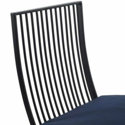 - This outdoor lounge set includes black metal frames, blue cushion seats, and a glass tabletop