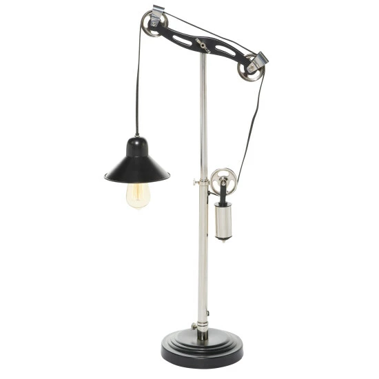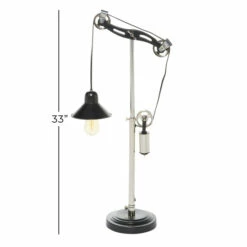 A functional and stylish night light is what this India-made black and silver table lamp is. The simplicity in its aluminum construction and pulley design concept matches well with industrial-themed bedrooms, personal libraries, and offices. It can also function as a tabletop display. This lampshade powers via plug-in electricity, and does not require batteries. Use 1 incandescent bulb. This item has a 40″ cord length. Suitable for indoor use only. A bell-shaped metal shade. Turn the light on and off via a cord switch. This item comes shipped in one carton.