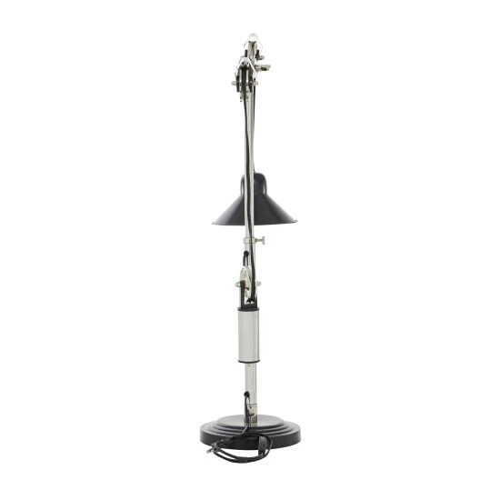 - The desk lamp has a polished silver metal stem and black shade and base
