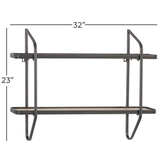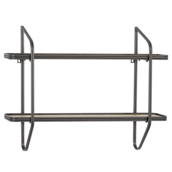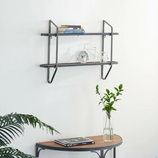 - This black and brown industrial wall organizer features 2 long and slim shelf tiers
