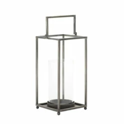 With its simple design and neutral finish, this minimalistic lantern can serve as a stylish addition to any room. Made of iron, the lantern’s frame has a rectangular shape and open sides that give you a clear view of the internal glass sleeve. Once you insert a candle into the lantern, the cylindrical sleeve will protect it from drafts. The lantern is propped up on four rounded feet, which allow it to rest on any flat surface. Add the lantern to a table or shelf in a modern-style room. Designed with ball stoppers at the base that prevent scratching furniture and table tops, as well as sliding around. This item ships in 1 carton. Metal handle for easy displaying. Suitable for indoor use only. Modern Design. Lantern candle holder can hold 1 pillar candle.