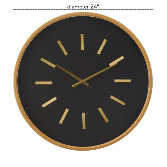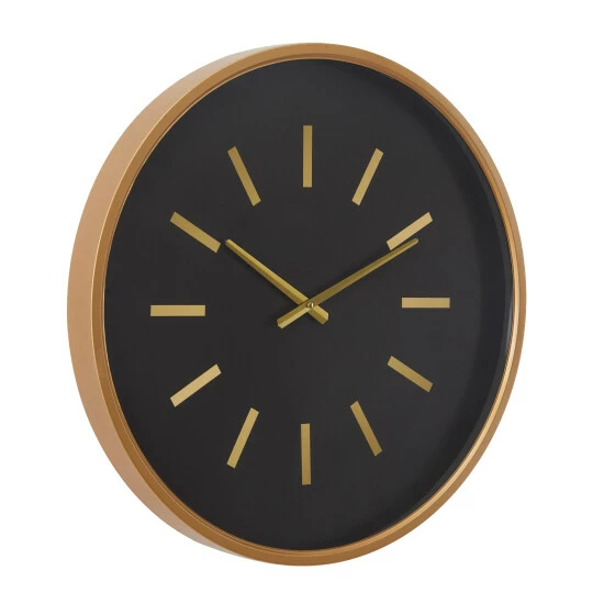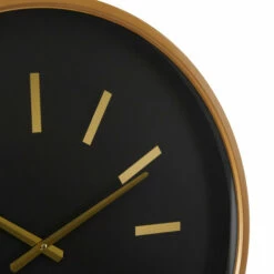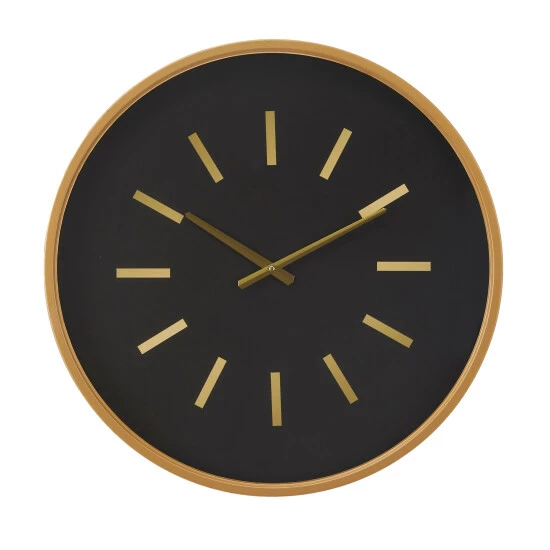 - This wall clock features a black clock face as well as a gold frame, clock hands, and line markings