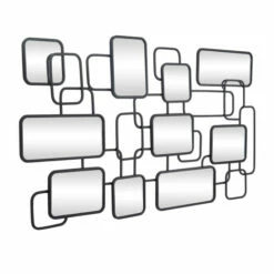 - A modern wall mirror featuring a rectangular structure with multiple geometric-shaped reflective glasses and metal accents