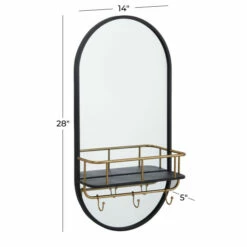 - Modern wall mirror featuring an oblong reflective glass panel with a black metal frame attached to a black rectangular shelf with gold fence style design and hangers