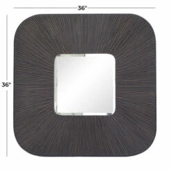 - A modern decorative mirror with a small square reflective mirror and a square wooden frame with round edges and radial pattern