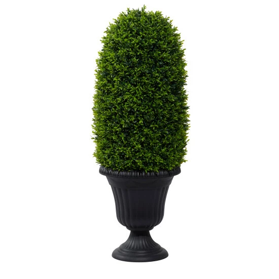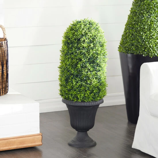 - This artificial foliage features a floor plant size and a vertical oval silhouette in a chalice-shaped pot