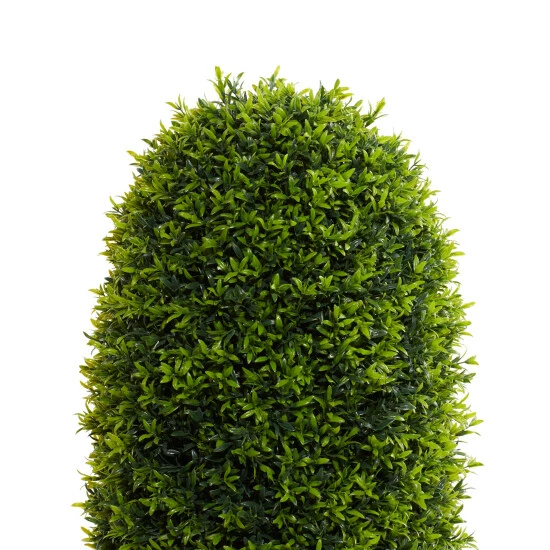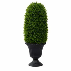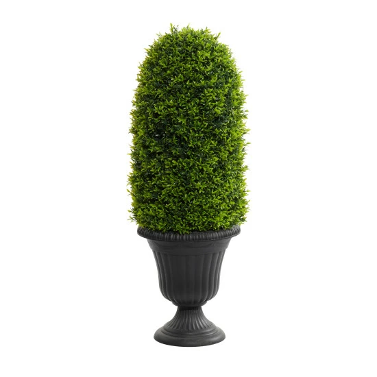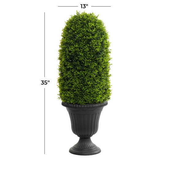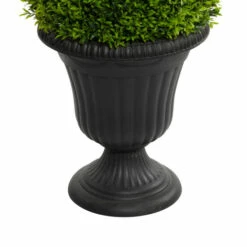 - This plastic topiary carries a glossy green finish and a matte black planter with ribbing