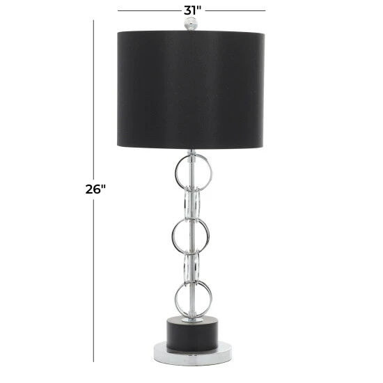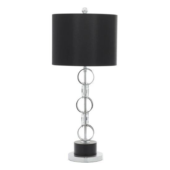 Illuminate any space with this opulent black metal table lamp on any surface space for a sophisticated look. Display it on top of a console dresser or a low-lying side table with decorative orbs and antique-looking hardbound books. This eye catching lamp makes a timeless addition to your surface space and beautifully lighten up its surrounding area. Designed with black flat stoppers at the base that prevent scratching furniture and table tops, as well as sliding around. A drum shaped table lamp shade made of linen. This table lamp features an On/Off Switch. Requires 1 Standard Type A bulb, not included. Suitable for indoor use only. Contemporary theme. This item comes shipped in one carton.. Crafted in a contemporary style that fits great in most homes. This black table lamp is made of polystone, metal and a linen shade. This metal table lamp carries a matte black shade and base accent with silver structure. A sleek black table lamp with ring accent that is slender and neutral in color to complement your existing décor. Accent table lamp measures 13″L x 13″W x 30″H and weighs 5 lbs.