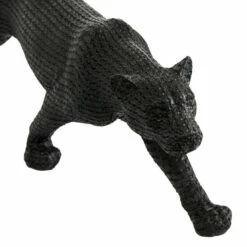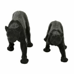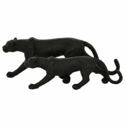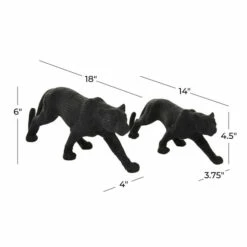 Add chic, slick style to your tabletops or shelves with this pair of large black jaguar statues. Crouched in hunting positions, these elegant black cats feature resin construction with powdered stone overlays for a hard, textural finish. These monochrome black jags have a semi-glossy finish and dimpling throughout in lieu of colored spots. This item is shipped in one carton. Suitable for indoor use only. This set includes 2 decorative sculpture. Contemporary design.