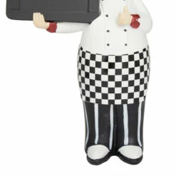 - A striking sculpture set featuring chef figures wearing complete uniform and holding chalkboard menus