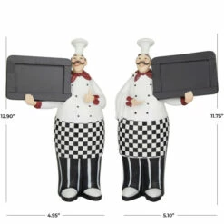 A traditional decorative sculpture set that personalizes your space as well as adding function to your kitchen with its chalkboard menus. This sculpture will elevate the look of any stylish home with its dimensions and textural appeal. An artistic display to showcase your personality and enhance the look of any open surface space. This item comes shipped in one carton. Suitable for indoor use only. This set comes with 2 sculptures. Traditional Setting.
