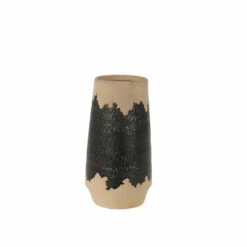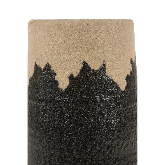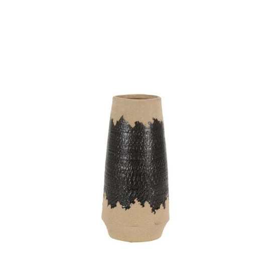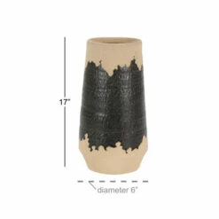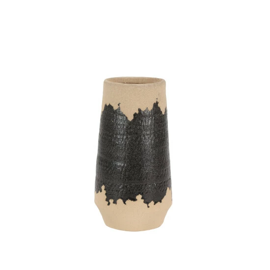 - Decorative natural tan and black vase with a glossy glaze fired over matte finished porcelain with rugged sand texture; eclectic brushstroke design hand-painted in shiny black glaze over the grainy, tan-colored base glaze