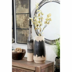 Bold and unique, this large decorative vase has tactile, handmade charm in its hand-painted glossy black glaze pattern over a matte tan base. The unique design in the center fills this round vase’s body for a bold contrast of solid, glossy black against grainy, textural neutral tan. Both handmade and hand-glazed, this unique vase brings eclectic style and charm to any tabletop or shelf top!