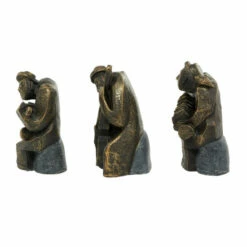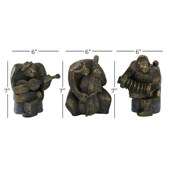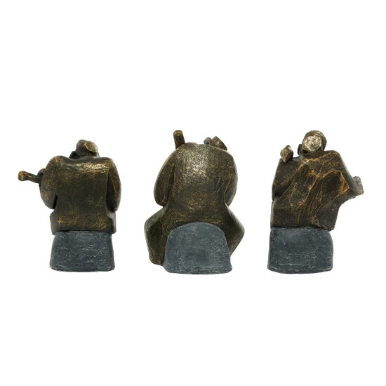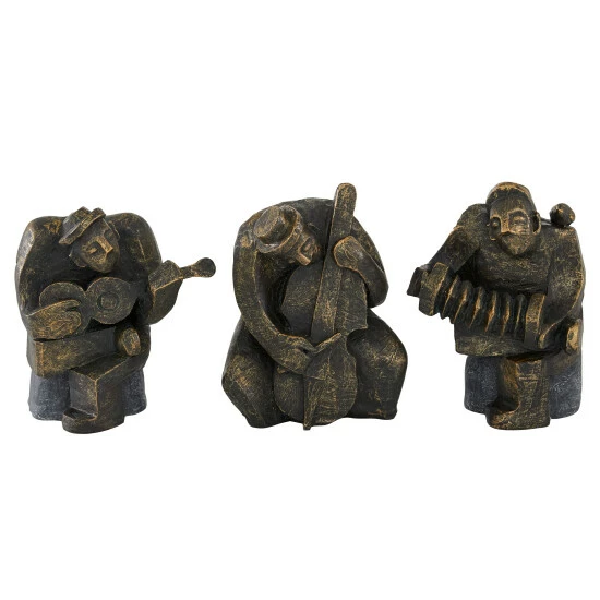 This three-piece trophy-looking tabletop decor set of musicians is a concrete art to behold with a design concept that harmonizes with rustic and contemporary living spaces. Place the sculptures on top of office desks, coffee tables, dressers, or hanging wall shelves with matching colors or textures to best appreciate their dark-gold finish. They can even double as paperweights. These polystone figurines balance on molded stone bases and stand 7″. Use as eye-catching pieces in contemporary or rustic style nests. Wipe clean with a dry cloth. Suitable for indoor use only. This is a 3-piece stone table display. Rustic design. This item comes shipped in one carton.