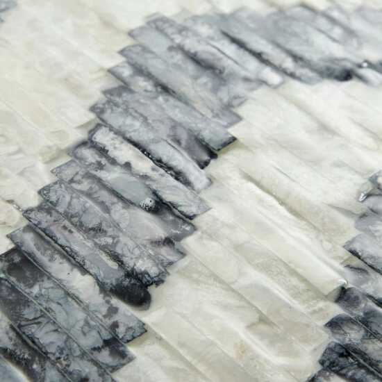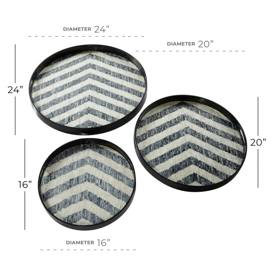 - Opalescent champagne and gray-colored shells forming a chevron pattern inside black wood trays with semi-glossy lacquer finishes