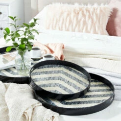 - MDF wood trays with natural capiz shell inlays for a modern appeal