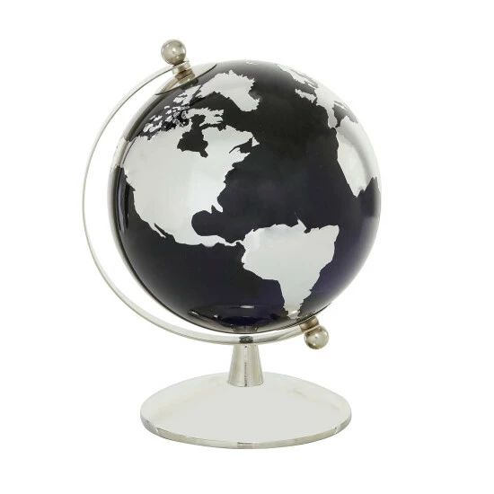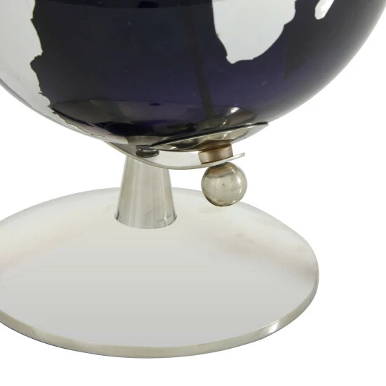 - A painted tempered glass globe balances on a sturdy stainless steel stand