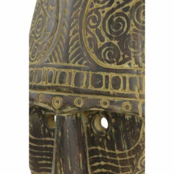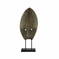 Handmade in Indonesia, this stunning tribal mask is made from hand-carved reclaimed teak wood with intricate hand-carved designs. The decorative mask is displayed on a black metal stand secured with 2 metal rods. The entire wood sculpture maintains its natural dark espresso and golden-brown hues and features intricate, hand-carved spirals and leaf-like patterns throughout the mask with circular holes cut out for the eyes. The side profile emits realistic dimension with a slight angle from the ceremonial headdress-shaped upper descending into the nose. Display this in your eclectic style inspired living room and add some traditional vibes in the atmosphere. Wipe clean with a dry cloth. Suitable for indoor use only. Made in Indonesia. Eclectic design. This item comes shipped in one carton.