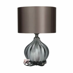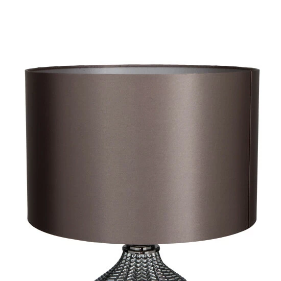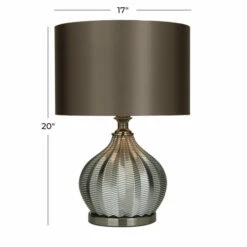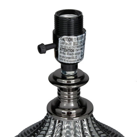Add a romantic ambience within your dashing living spaces as you illuminate the room with a warm glow with this chic dimmable table lamp. Display it on top of a console dresser or a low-lying side table with decorative orbs, hardbound books or magazines for a balanced look. This eye catching lamp makes a playful addition to your surface space and beautifully illuminate its surrounding area. Designed with black felt stoppers at the base that prevent scratching furniture and table tops, as well as sliding around. This table lamp features a 60Hz type A light bulb (not included). This item comes shipped in one carton. This item is suitable for indoor use. This glass table lamp features a polyester drum shade. This table lamp features a off/on switch. Transitional style.. Furniture lines are simple yet sophisticated, featuring either straight lines or rounded profiles.. This round table lamp is made of robust iron, durable tempered glass, and high quality polyester fabric. This luxurious round table lamp showcases a stunning high polished black tempered glass body and a black nickel finished neck and base. This black bedroom table lamp showcases a striking rounded edged tempered glass body with geometric leaf carvings, a round polyester shade, and a sleek iron base with a plug-in cord feature. This item measures 17″L x 14″W x 20″H and weighs 5 lbs
